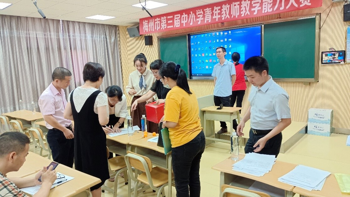 在梅州市学艺中学两个比赛场地,市教师发展中心高惠琴、林小良和洪华标三位老师一早到位,组织着来自全市参加此次比赛活动的评委和选手进行报到。经过前期紧张而忙碌的工作,评委和选手签到、防疫材料收集,选手的比赛顺序抽签和课件拷贝、评委们评分标准的培训等工作顺利完成。