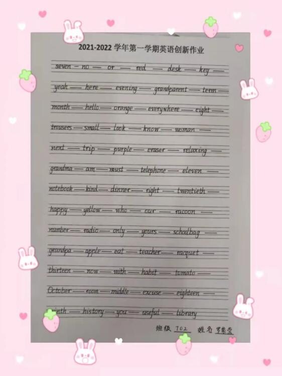 “双减”作业新模式,想方设法创新作业形式,激发学生学习兴趣,提高作业质量,增加趣味性和实用性,拓宽学生的文化视野,将孩子们快乐学习、幸福成长作为努力的方向。为增强各年级学段学生英语学习兴趣,推动学生乐学创新,英语组将趣味性、激励性、竞赛性融入英语学习中。如,为低年级段学生设计了字母乐园、主题手抄报等作业;为中年级段学生布置自创绘本作业,展示自己上学的方式;为高年级段学生设计了英语单词接龙作业等。