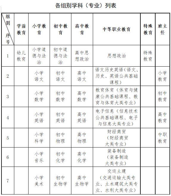 关于大赛组别,《方案》明确,市级大赛设学前教育、小学教育、初中教育、普通高中教育、中等职业教育、特殊教育和班主任7个组别。其中,学前教育组别由幼儿教育1个专业组成,小学教育组别由11个学科组成,初中教育组别由15个学科组成,普通高中教育组别由16个学科组成,中等职业教育组别由10个学科(专业)组成,特殊教育组别由特殊教育1个专业组成(含中小学及中职特殊教育教师),班主任组别由4个学段组成,大赛共计58个学科(专业、学段)。