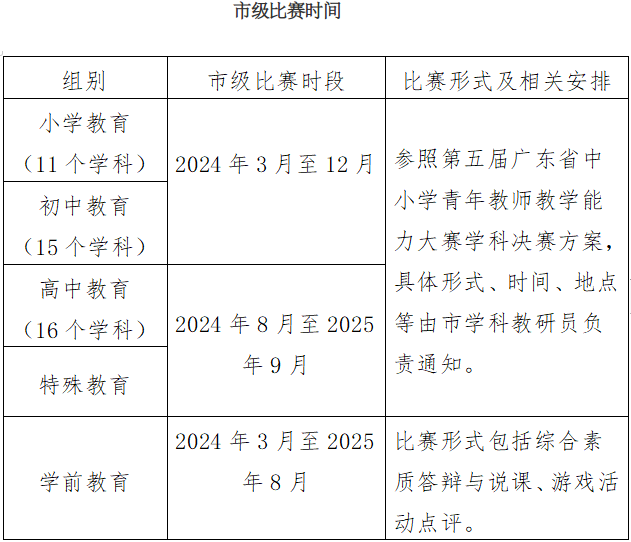 《方案》指出,参赛教师须同时满足以下条件:一是本市普通中小学校、中职学校、高职院校中职部、幼儿园、特殊教育学校中40岁及以下(1985年8月31日后出生),且在2025年8月31日前教龄满4年;特别优秀者,年龄可放宽至45周岁。二是具备相应教师资格的在岗专任教师(含民办学校教师)。值得一提的是,每位教师只能参加一个学科(专业、学段)的比赛,曾获得往届广东省中小学青年教师教学能力大赛各组别总决赛第一名的教师不再参加本届比赛活动。