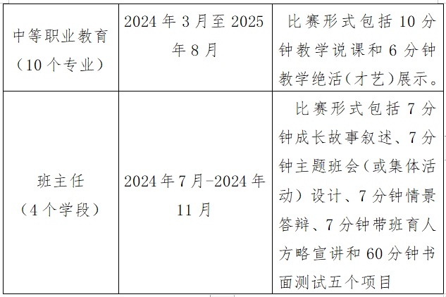 关于大赛内容,《方案》明确,学前教育青年教师教学能力大赛的内容包括综合素质答辩(含游戏、一日生活、环境创设等)、说课、游戏活动点评、活动展示、才艺展示等。中小学教育(含小学教育、初中教育、普通高中教育,下同)各学科青年教师教学能力大赛的内容包括学科专业技能、教学通用技能,主要通过解题命题、说课、课堂教学及演讲答辩等方式来展示。中等职业教育(含中等职业学校、高职院校中职部)青年教师教学能力大赛的内容包括课堂教学说课(1或2学时)、教学绝活展示(专业技术展示、演讲、板书、视频、作品介绍等)、主题演讲及现场答辩。特殊教育青年教师教学能力大赛的内容包括课堂教学设计与陈述、案例分析、答辩及演讲等。班主任大赛的内容包括成长故事叙述、主题班会(或集体活动)设计、情景答辩、带班育人方略宣讲和书面测试五个项目。
