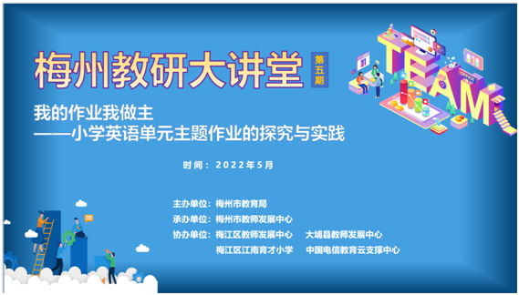 以梅江区、大埔县小学英语教研团队为主体,以短课例展示、教研沙龙、微讲座等形式,聚焦“小学英语单元主题作业优化设计”主题开展探索、展示和交流活动,深入探究“双减”背景下提升课堂教学质量和育人方式转型的有效模式,展示我市、县(市、区)、校三级教研团队作业优化设计研究的阶段性成果,研讨落实义务教育新课程标准。