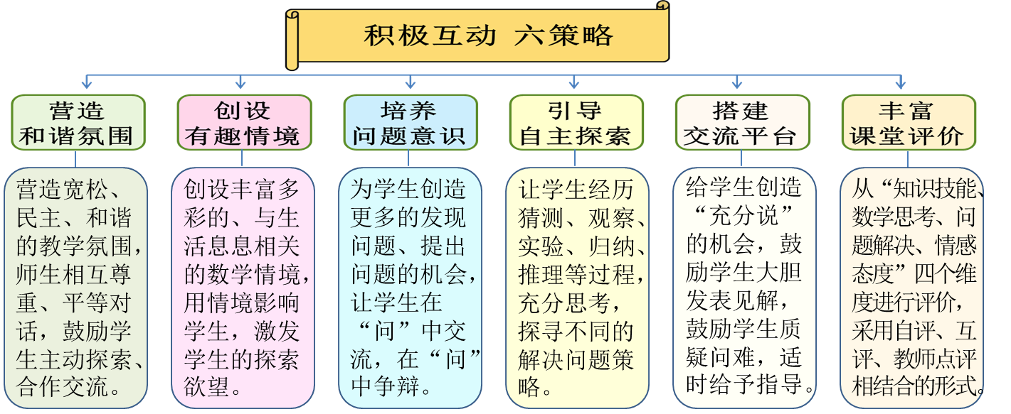 营造和谐氛围→创设有趣情境→培养问题意识→引导自主探索→搭建交流平台→丰富课堂评价”师生积极互动“六策略”,意在引导学生在主动参与、互动中敢于质疑、敢于争辩,从不同角度、不同方面去思考数学知识的本质,提高学生的批判性思维能力。