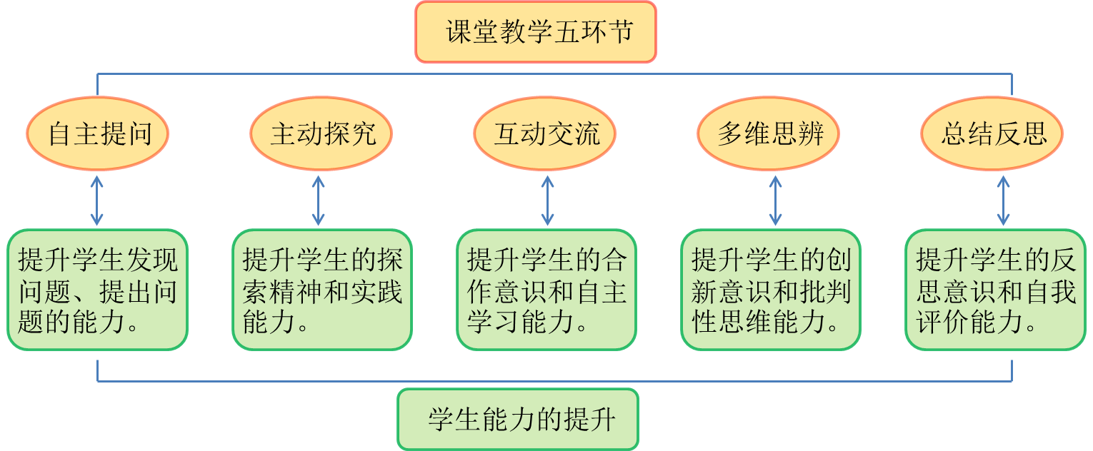 自主提问→主动探究→互动交流→多维思辨→总结反思”五环节教学模式以学生为中心,让学生在丰富、生动的数学学习活动中,实现有效的、多向的和高质量的互动,发展学生的高阶思维,培养学生的创新意识和创新能力。