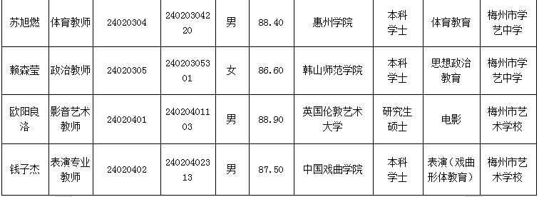 根据《广东省事业单位公开招聘人员办法》和《2024年广东省梅州市直属公办学校专场招聘紧缺学科教师公告》要求,经报名、资格审核、笔试、面试、体检、考察等程序,拟聘用郑伊琛等11位同志为梅州市教育局下属事业单位工作人员,现予以公示(具体人员信息附后)。