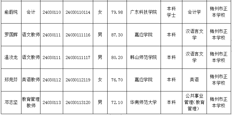 根据《广东省事业单位公开招聘人员办法》和《2024年梅州市教育局下属事业单位公开选聘工作人员公告》要求,经报名、资格审核、笔试、面试、体检、考察等程序,拟聘用王怡等14位同志为梅州市正本学校工作人员,现予以公示(具体人员信息附后)。