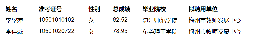 根据《广东省事业单位公开招聘人员办法》(广东省人民政府令第139号)和《关于做好我市事业单位公开招聘工作有关问题的通知》(梅市明电〔2012〕251号)等文件规定,经过发布《2021年梅州市教育局下属事业单位公开招聘人员公告》、报名、资格审查、面试、体检、考察等程序,经审核,拟聘用李翠萍等2位同志为梅州市教师发展中心工作人员,现予以公示(具体人员信息附后)。