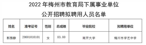 根据《广东省事业单位公开招聘人员办法》(广东省人民政府令第139号)和《关于做好我市事业单位公开招聘工作有关问题的通知》(梅市明电〔2012〕251号)等文件规定,经过发布《2022年梅州市教育局下属事业单位公开招聘人员公告》、报名、资格审查、面试、体检、考察等程序,经审核,拟聘用郭雅静同志为事业单位工作人员,现予以公示(具体人员信息附后)。