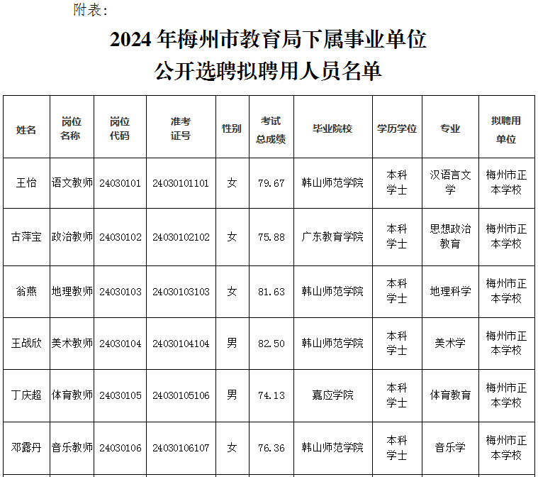 根据《广东省事业单位公开招聘人员办法》和《2024年梅州市教育局下属事业单位公开选聘工作人员公告》要求,经报名、资格审核、笔试、面试、体检、考察等程序,拟聘用王怡等14位同志为梅州市正本学校工作人员,现予以公示(具体人员信息附后)。