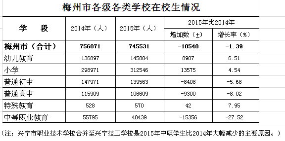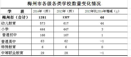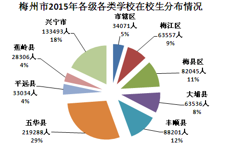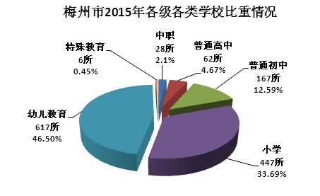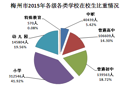 2015年,全市共有各级各类学校1327所,同比增加46所;各级各类学校在校学生745531人,同比减少10540人。