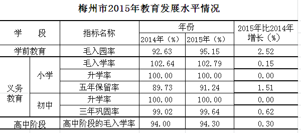 2015年,学前教育毛入学率95.15%,同比增长2.52%;小学毛入学率102.79%,同比增长0.15%,小学五年保留率为91.24%,同比增长1.51%;初中阶段三年巩固率99.64%,同比增长0.62%;高中阶段毛入学率94.3%,同比增长0.3%。