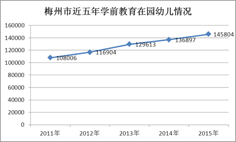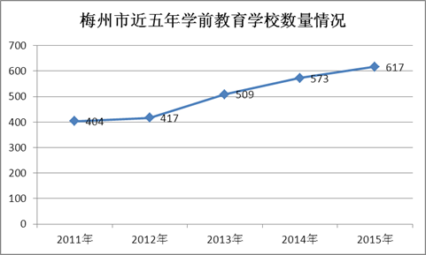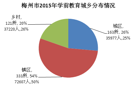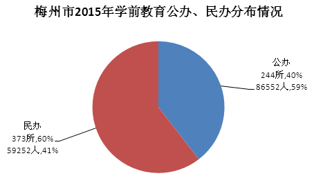 2015年全市共有幼儿园617所,同比增加44所;全市幼儿数145804人,同比增加8907人;公办幼儿园244所,在园幼儿86552人,占59%,民办幼儿园373所,在园幼儿59252人,占41%。