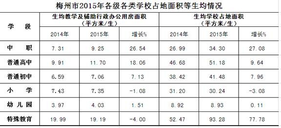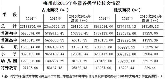 2015年,全市各级各类学校占地面积23440356.15平方米,同比增加261100.15平方米;校舍建筑面积8793193.13平方米,同比增加149169.13平方米。